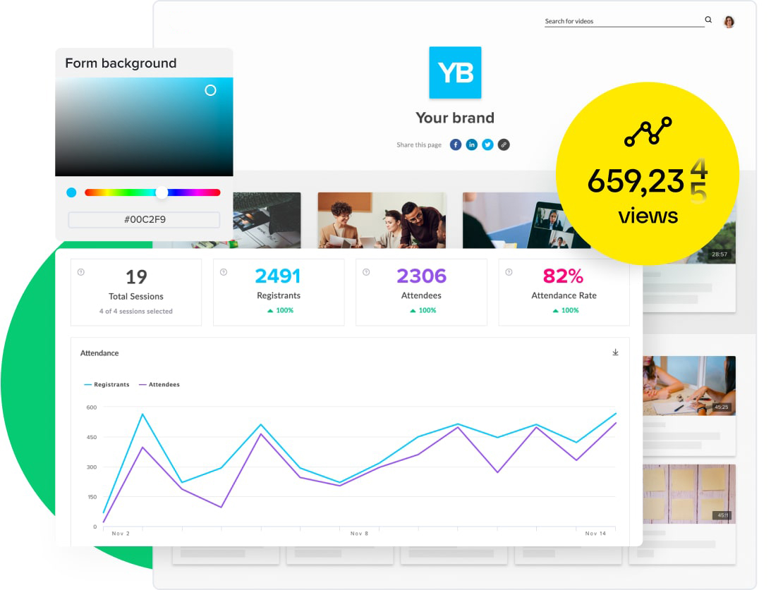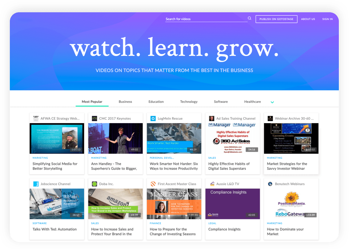 Grabe el evento y compártalo en GoToStage, la plataforma de seminarios web a la carta a la que millones de profesionales acuden para aprender. Llegue a nuevas audiencias y haga que su empresa crezca, ya que el evento se podrá ver todas las veces que se quiera.